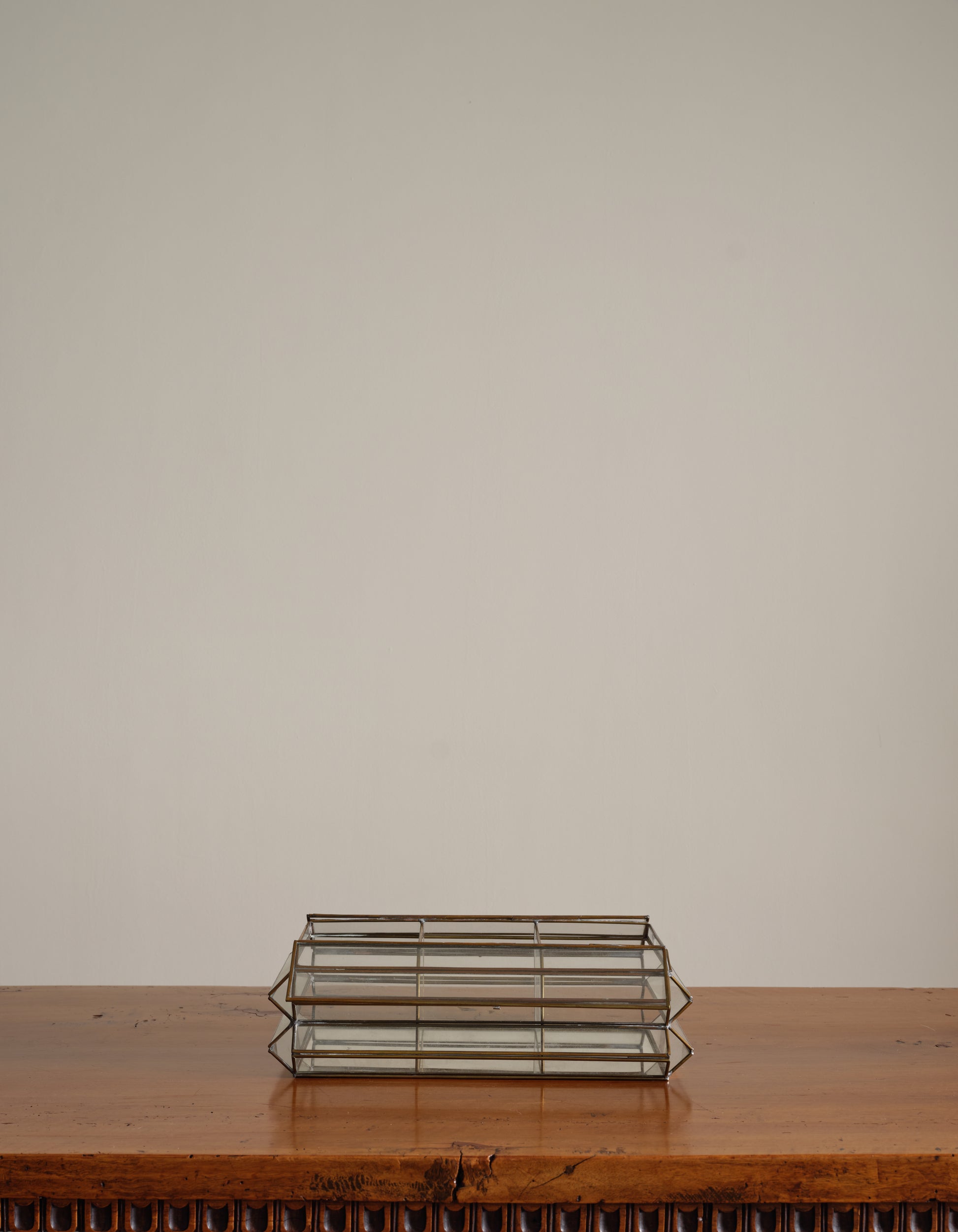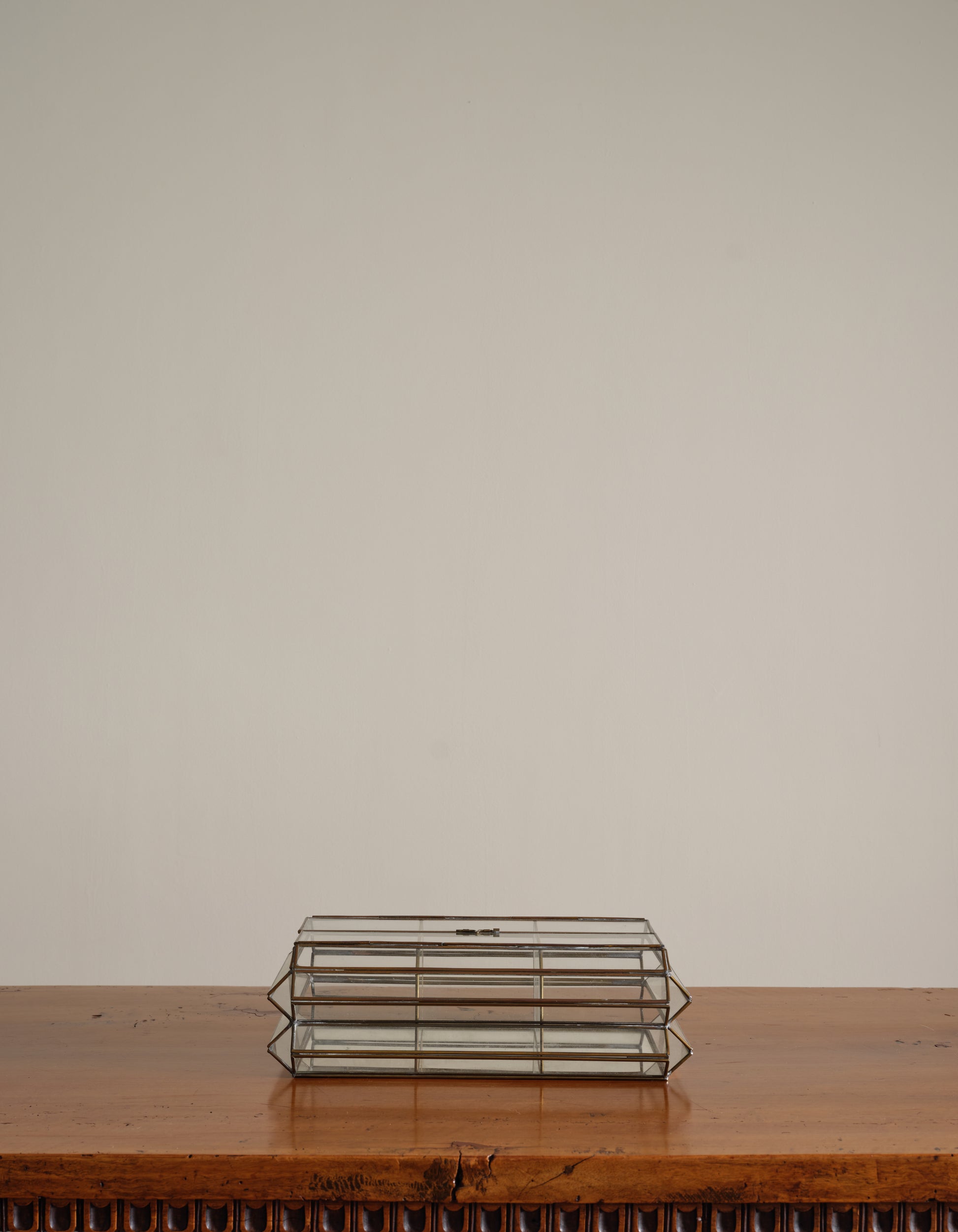 Vintage glass mirrored display case featuring a geometric metal frame and clear glass panels. The mirrored base reflects light beautifully, making it ideal for showcasing jewelry, collectibles, or small decorative pieces. Its understated design complements both vintage and modern interiors.