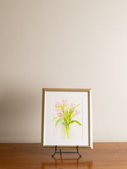 A framed watercolor painting by Nancy O’Neill, titled Pink Tulips. Presented in a metallic frame with matting.