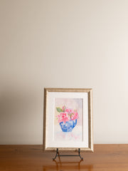 A framed watercolor painting by Nancy O’Neill, titled Roses in Blue Pitcher. Presented in a metallic frame with matting.