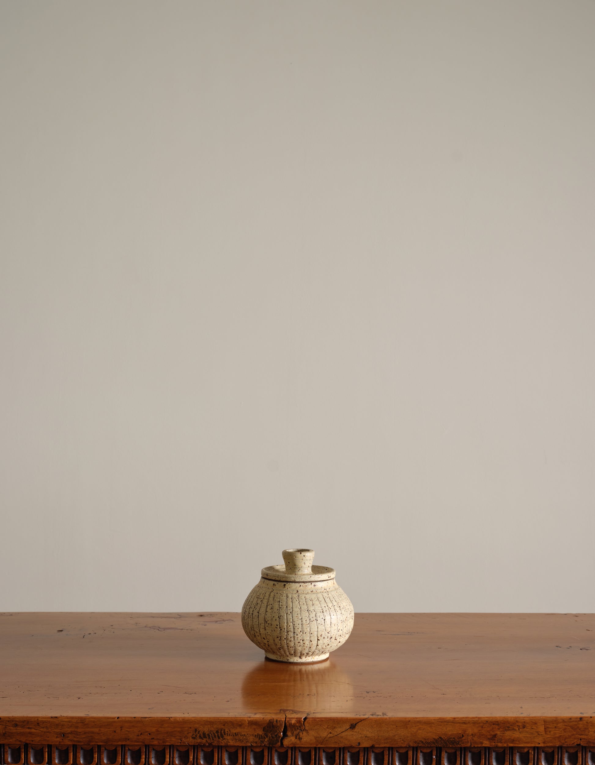 A vintage ceramic bowl with a rounded form and matching lid, finished in a warm white glaze with subtle yellow speckling. Its handmade texture and earthy tone add a natural charm, perfect for display or functional use. Wear consistent with age.